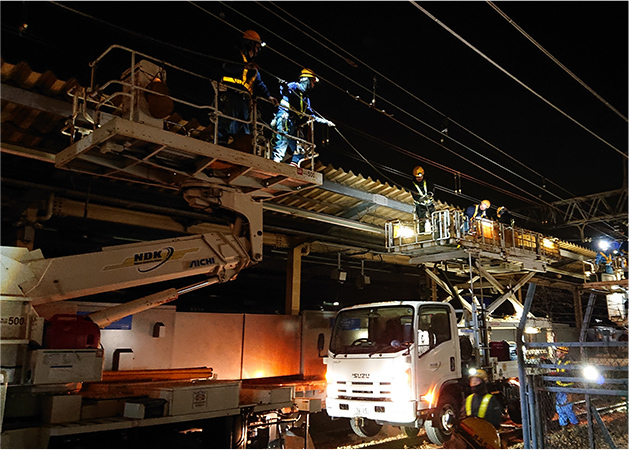 三光電気工事は、鉄道の電車線設備や電灯電力設備の新設・保守・改修工事を担い、社会インフラを支える企業です。JR電車線工事をはじめ、電灯工事や変電設備、さらにLED照明などの内線設備工事も展開し、皆様の移動を安心・安全に守っています。私たちの仕事は、毎日「問題なし」を積み重ねること。仲間とともに、電車が止まらない日常を支える誇りを感じながら働ける環境です。