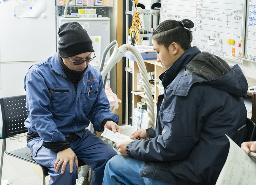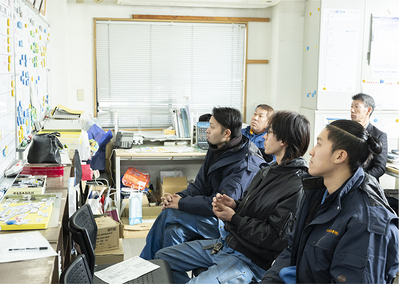 出社後、点呼と当日の作業手順を確認します。